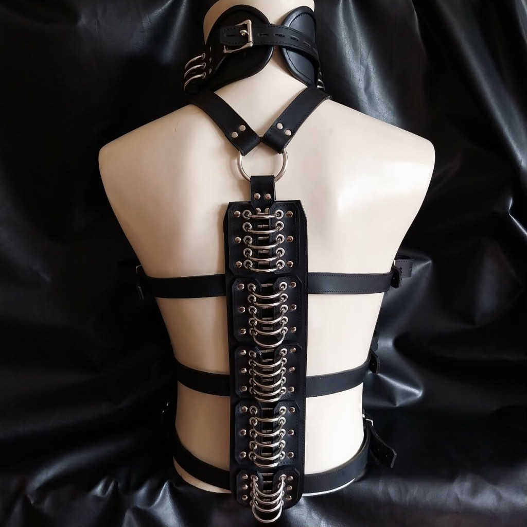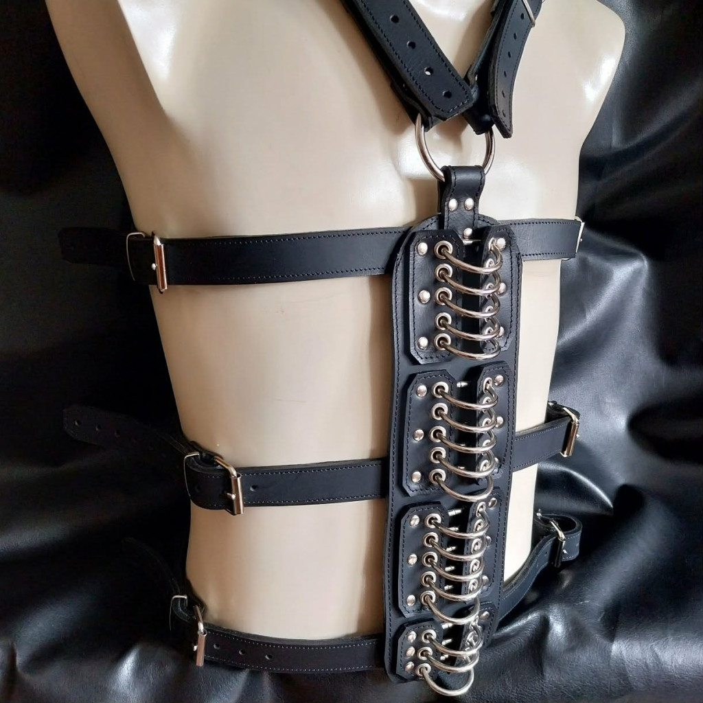 Ez a férfi bőr fétis ruha egy valóban különleges darab: robusztus, feltűnő és egyedi. A gerinc mentén futó karikás dizájn, a vastag bőr alap és a tökéletesen állítható kialakítás együtt egy prémium kategóriás terméket eredményez. Ha olyan kiegészítőt keresel, ami nem csak funkcionális, hanem vizuálisan is erős statement, akkor ez a bdsm hám pontosan neked készült.