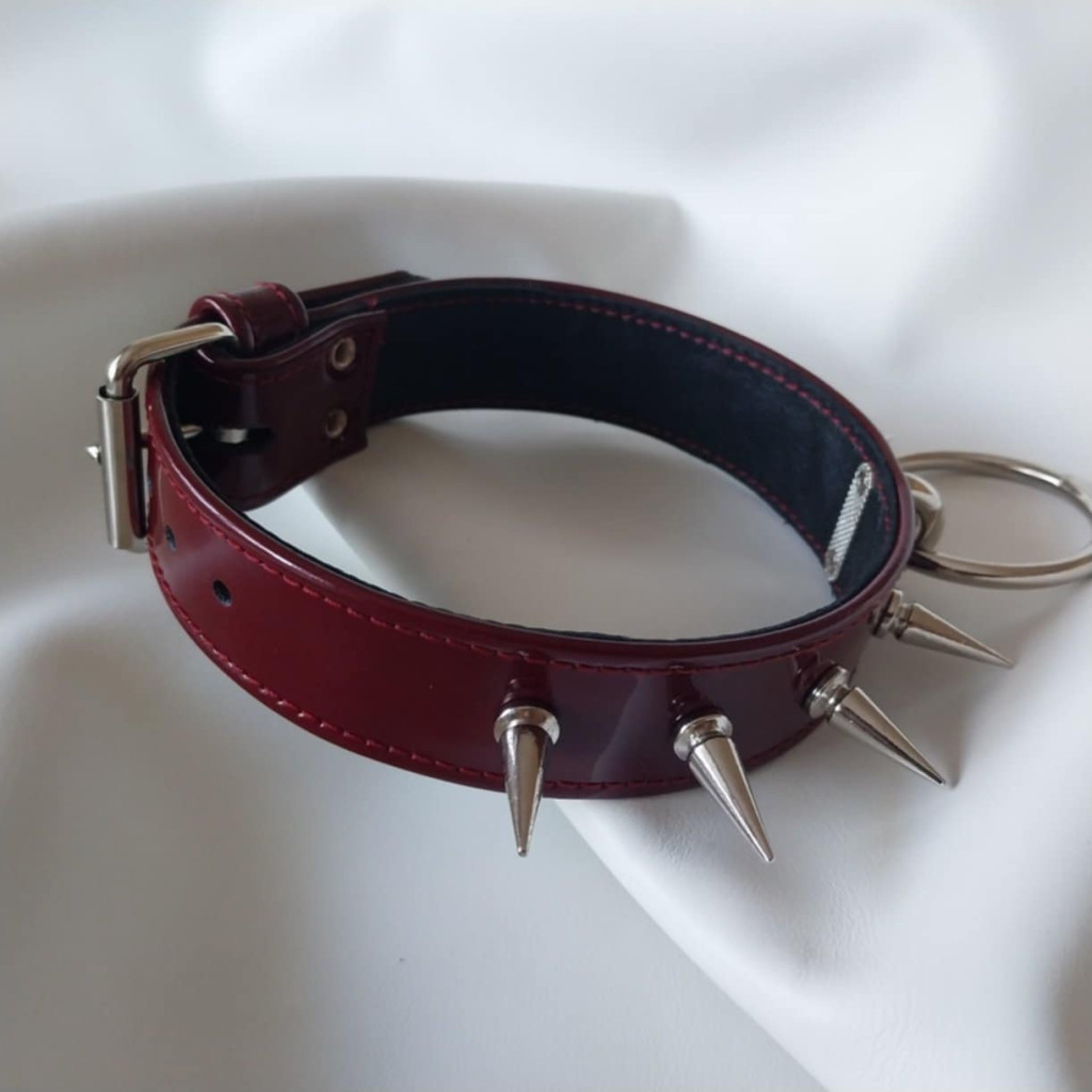 Patent leather is one of the most striking materials in the world of BDSM accessories. Its lacquered, smooth surface creates strong contrast with the raw character of the spikes and metal ring. The depth of the burgundy color adds elegance to the dominant look.