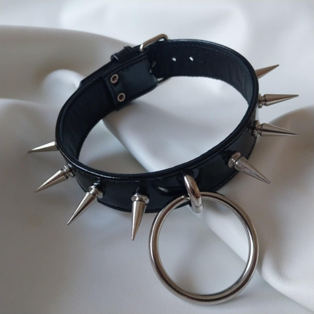 The three-layer construction, glossy patent leather, spike detailing, and large central ring together create the unique character of this lockable patent leather collar. Handmade, custom-fit, and durable.