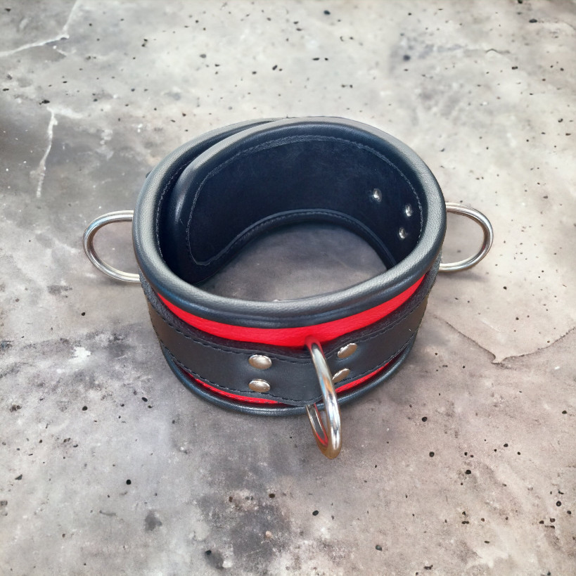 This red leather BDSM neckcuff is a functional accessory. The deep red genuine leather gives a bold presence, while the sturdy construction ensures secure attachment for various BDSM setups.
