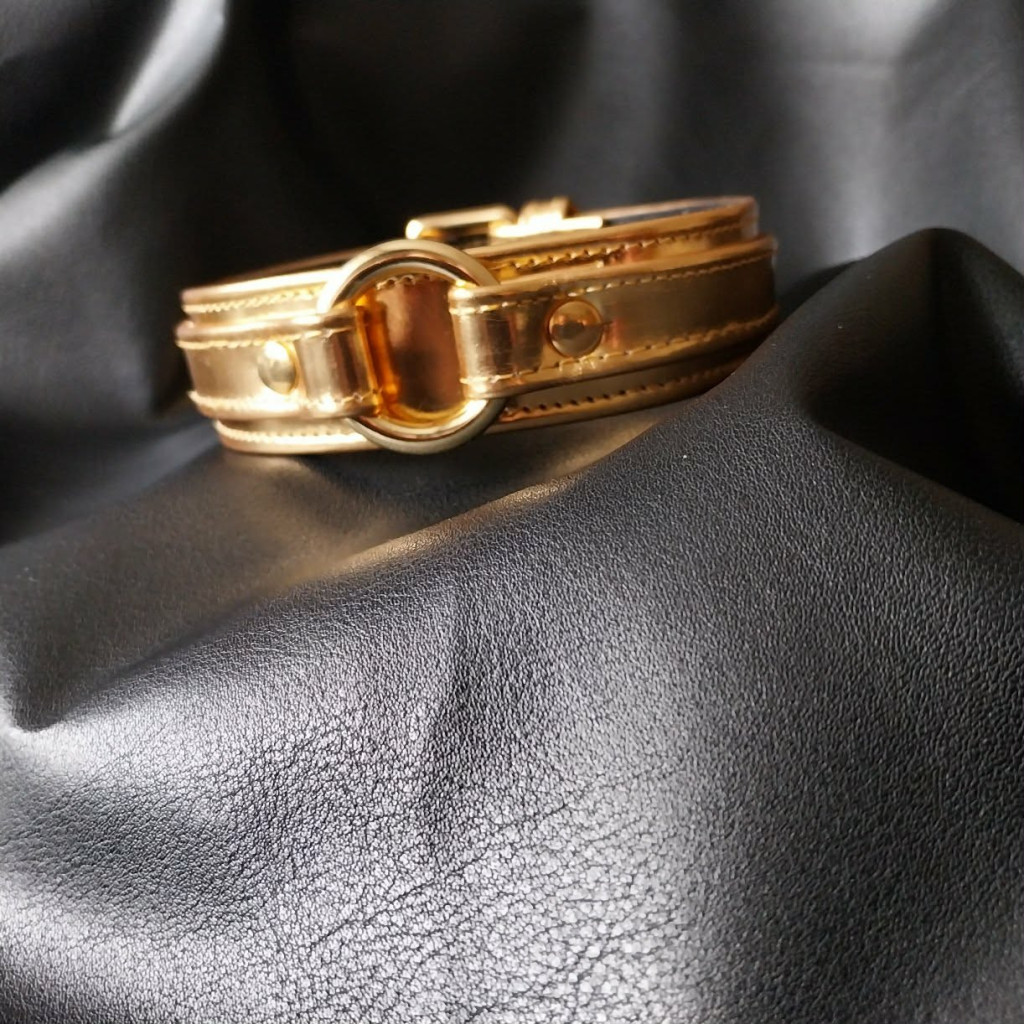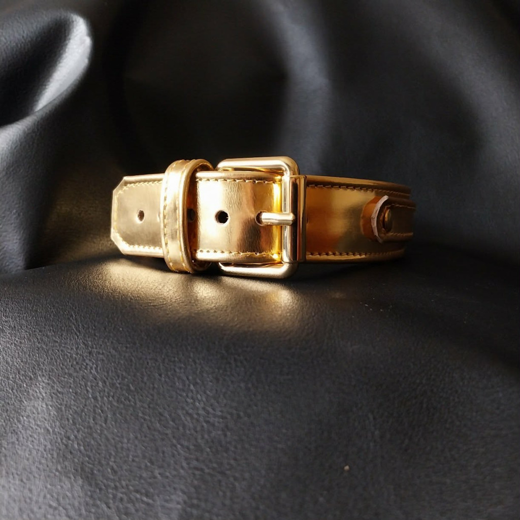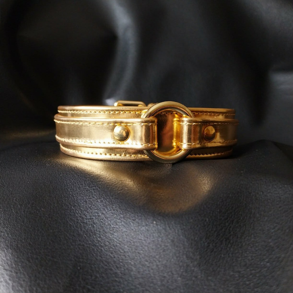 Ez a fényes, csillogó arany színű Bdsm bőr nyakörv tökéletes választás. Háromrétegű, a fényes arany tónusával minden tekintetet magára vonz, miközben a prémium minőségű anyagok és a  kivitelezés garantálják a tartósságot .