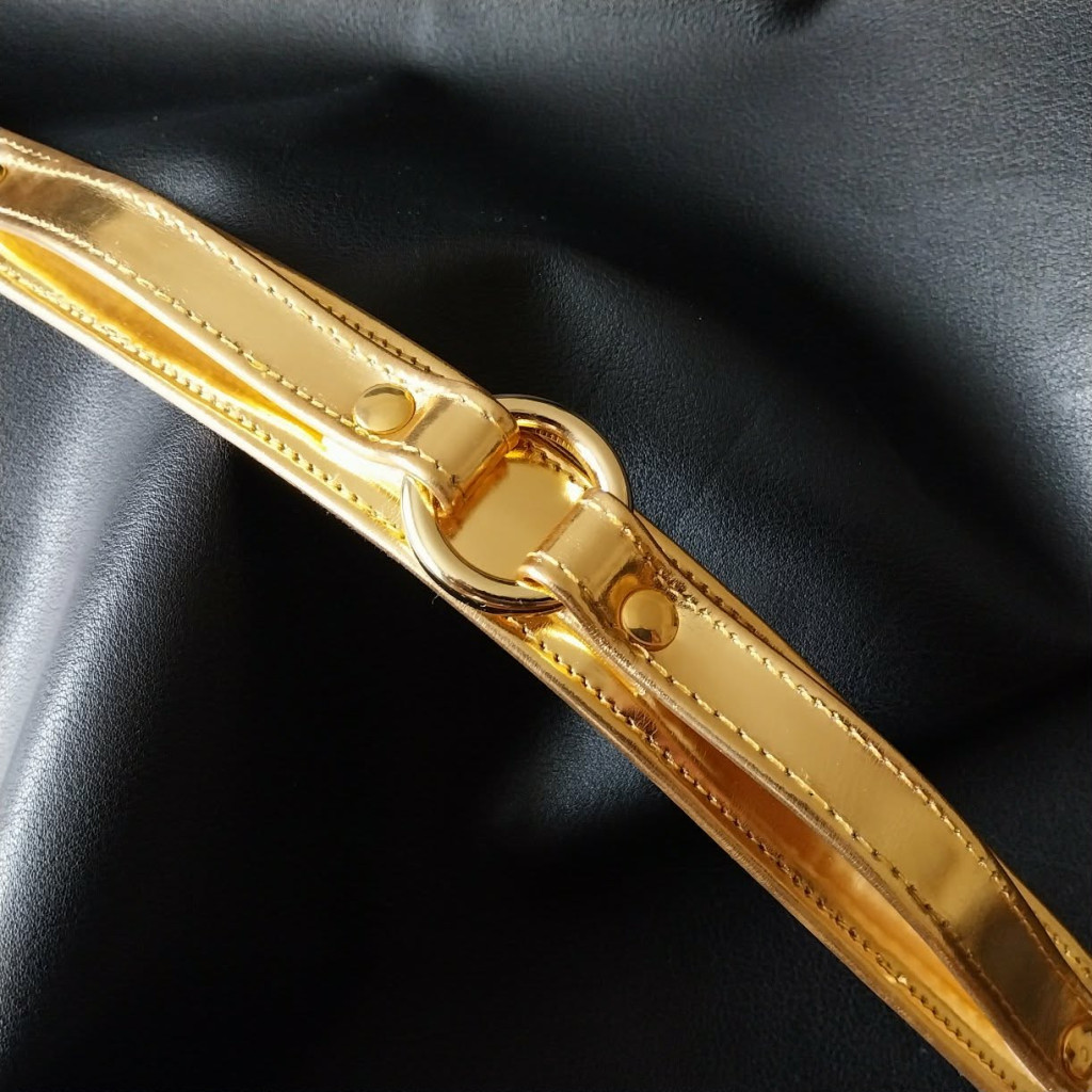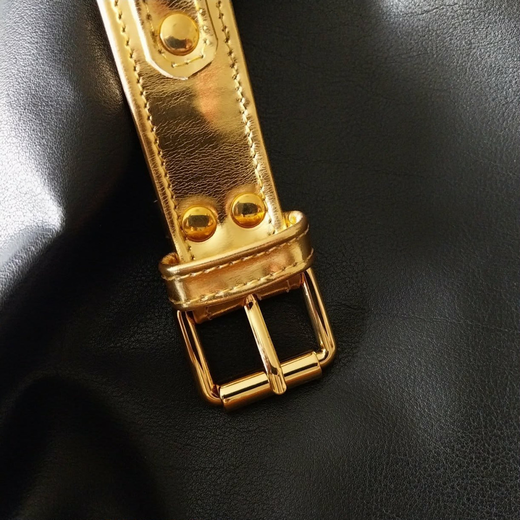 Minden szegecs, az elöl lévő karika és a hátoldali csat egységes arany színű.