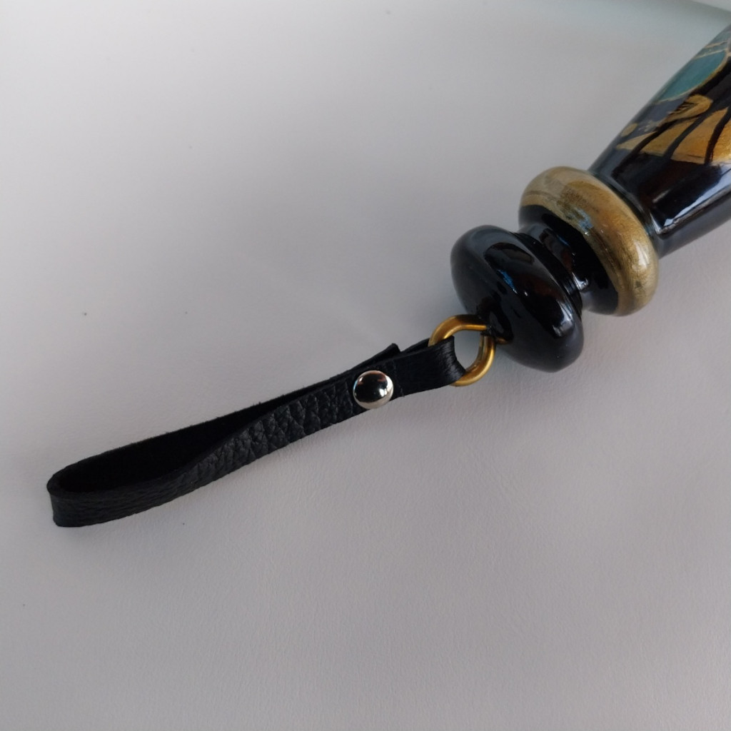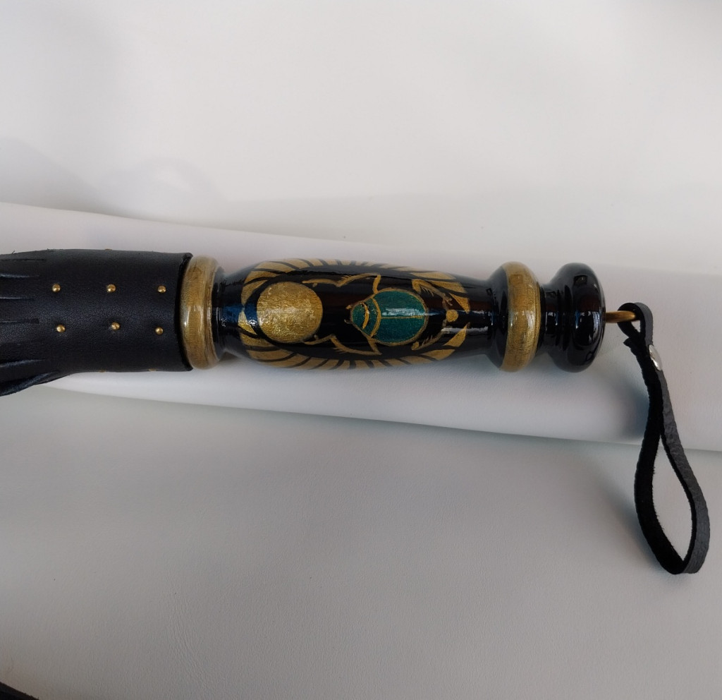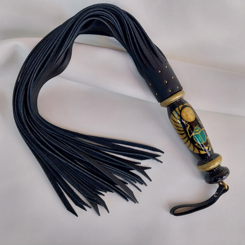 This BDSM whip features the scarab beetle, a symbol of rebirth and transformation, one of the most sacred animals in ancient Egyptian culture. The hand-painted design is created with acrylic paints, highlighting the intricate details of the beetle’s special hieroglyphic form, symbolizing “becoming something.”