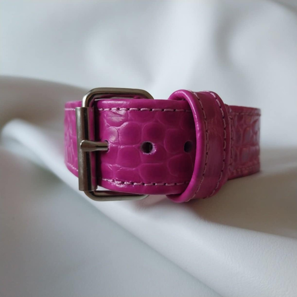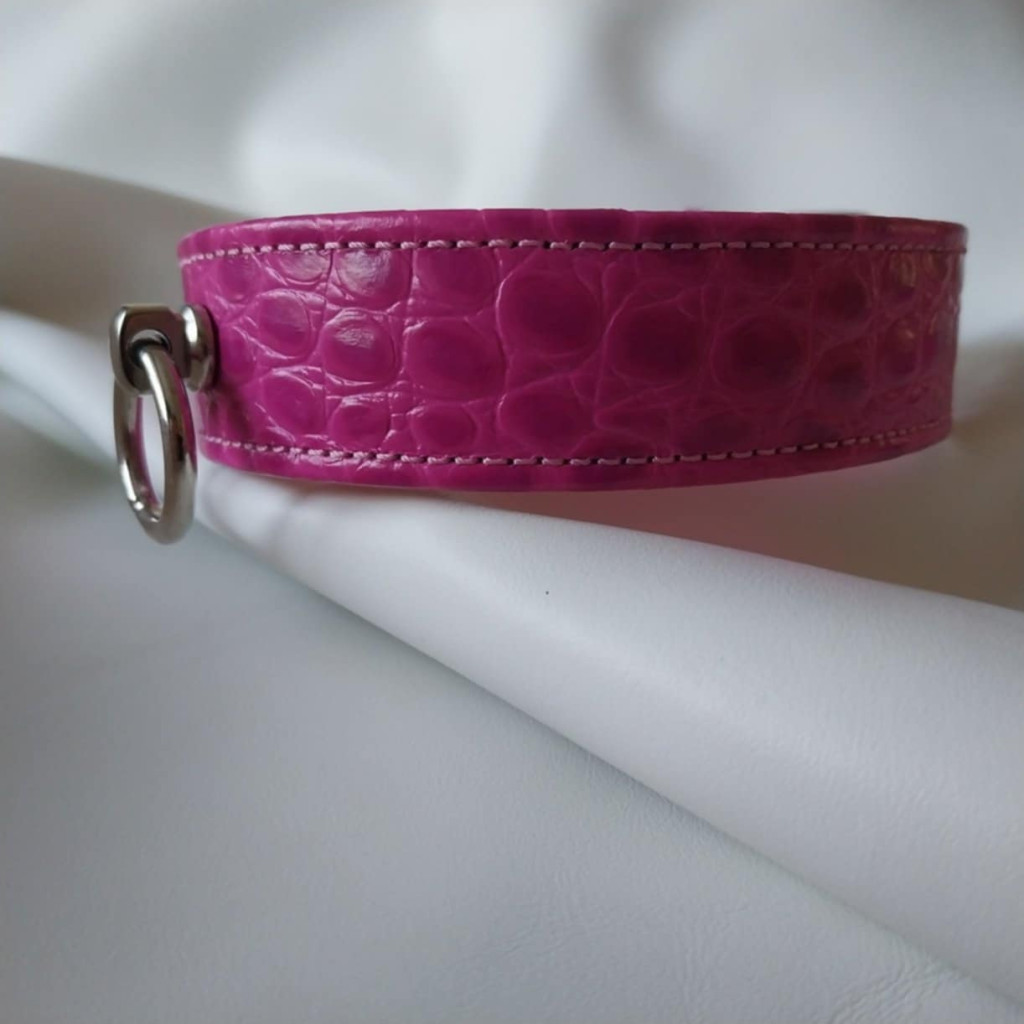 This pink crocodile-patterned fetish leather collar is a premium-category accessory with a unique appearance, combining a striking style with high-quality craftsmanship. The use of genuine leather, the special color combination, and the handcrafted finishing make it distinctive and characterful.