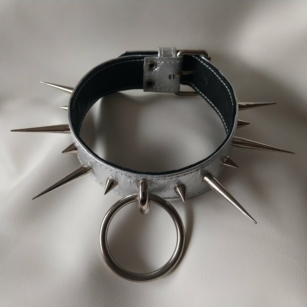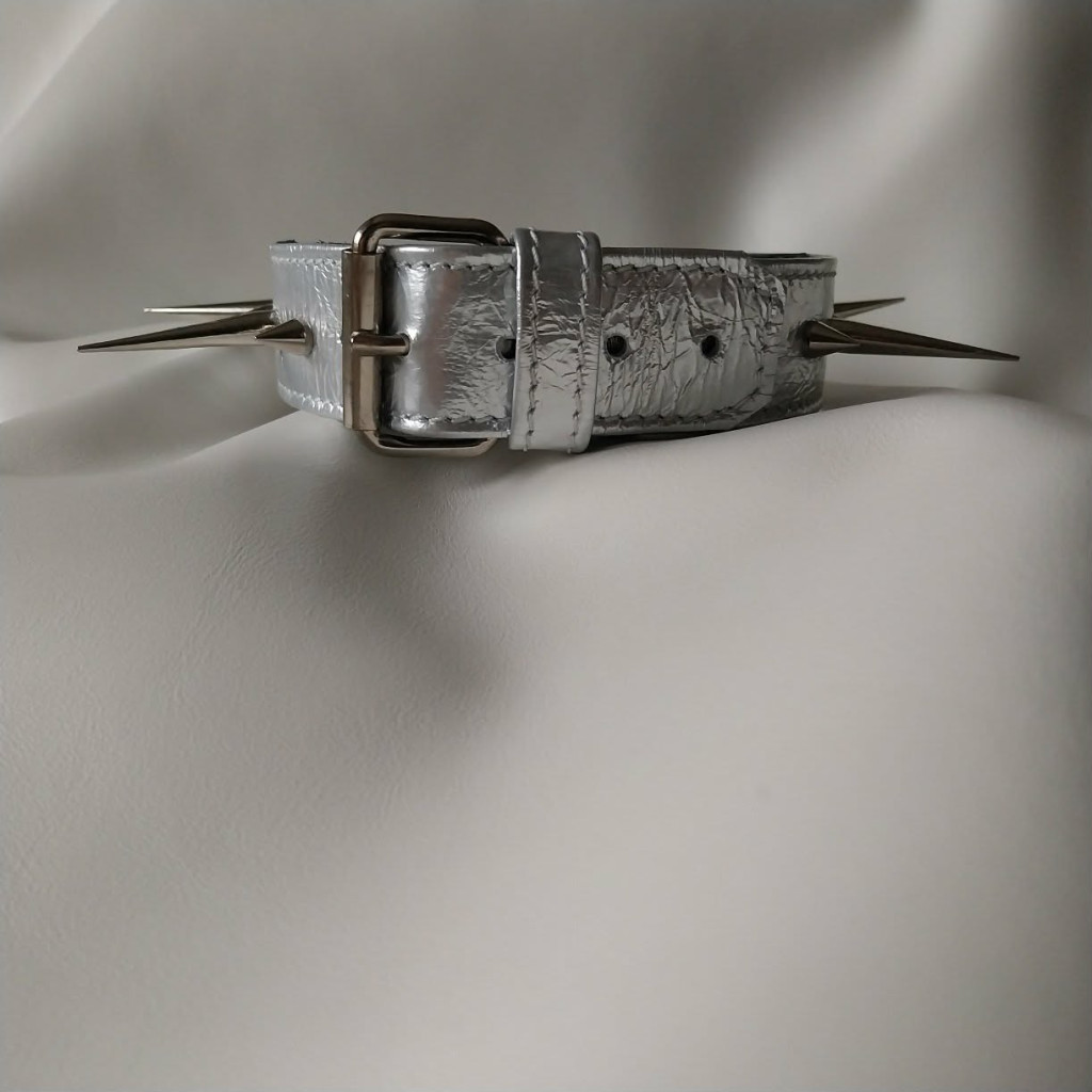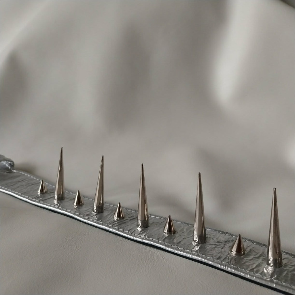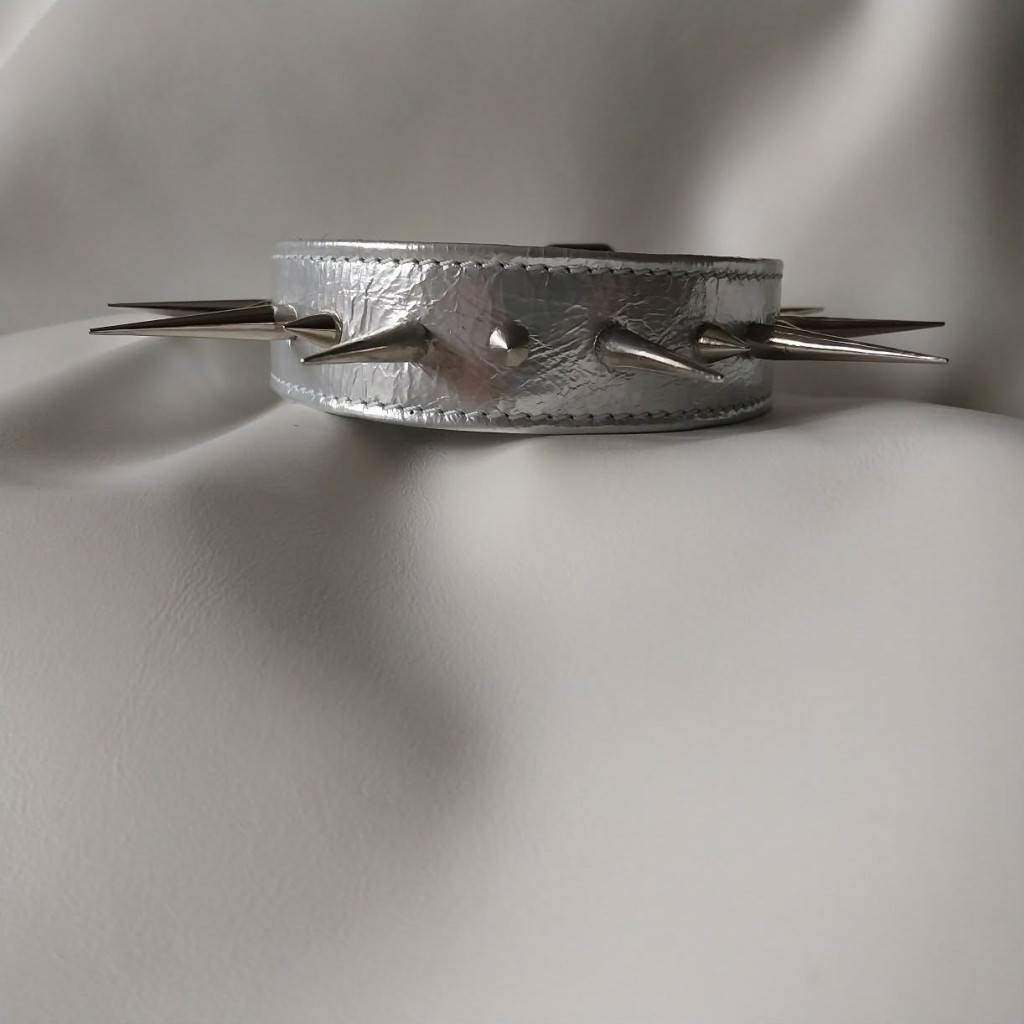 It perfectly combines comfort with a bold appearance. The soft inner layer ensures comfort during extended wear, while the spikes and shiny silver surface guarantee attention.